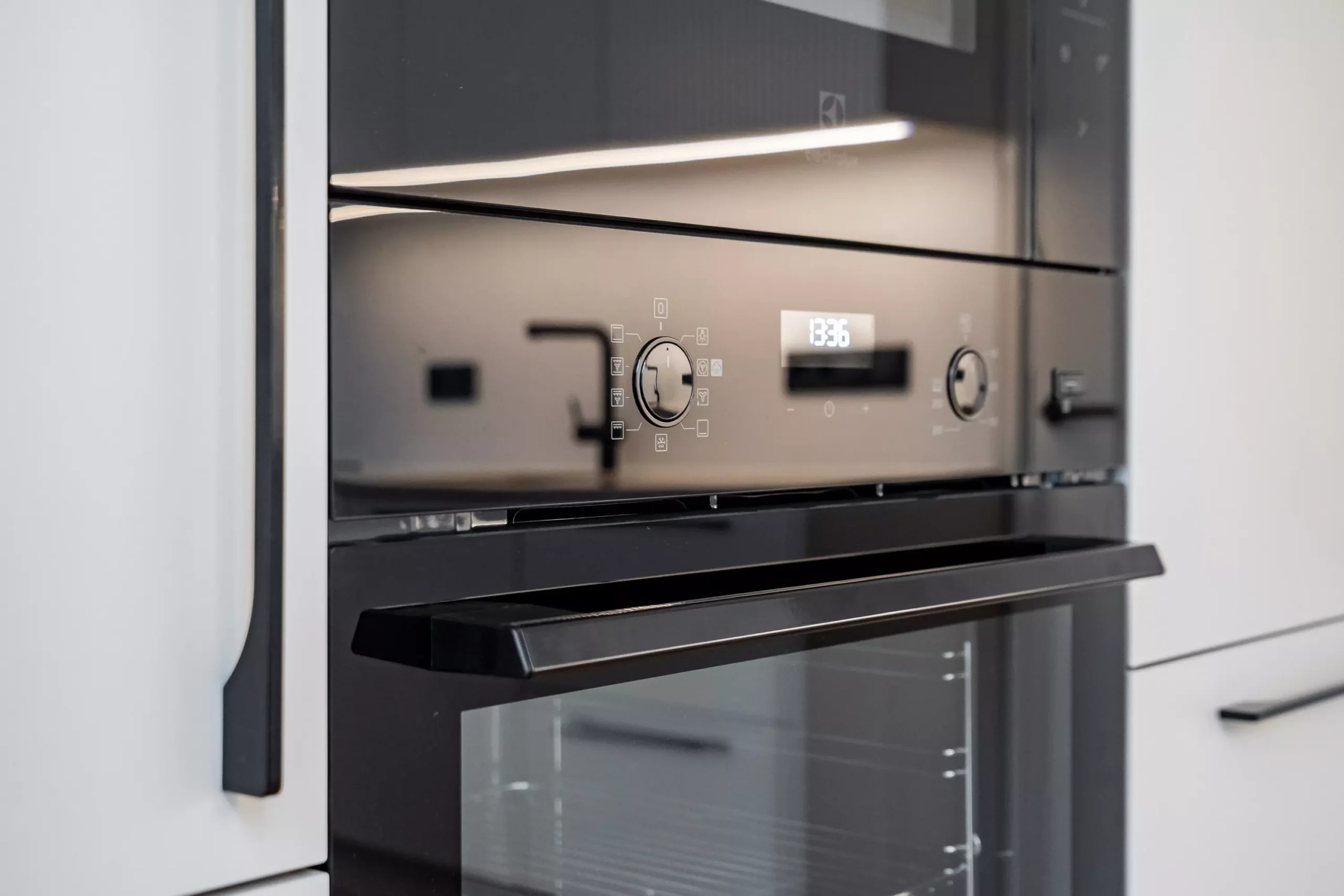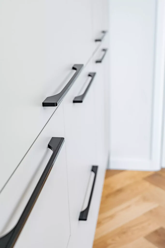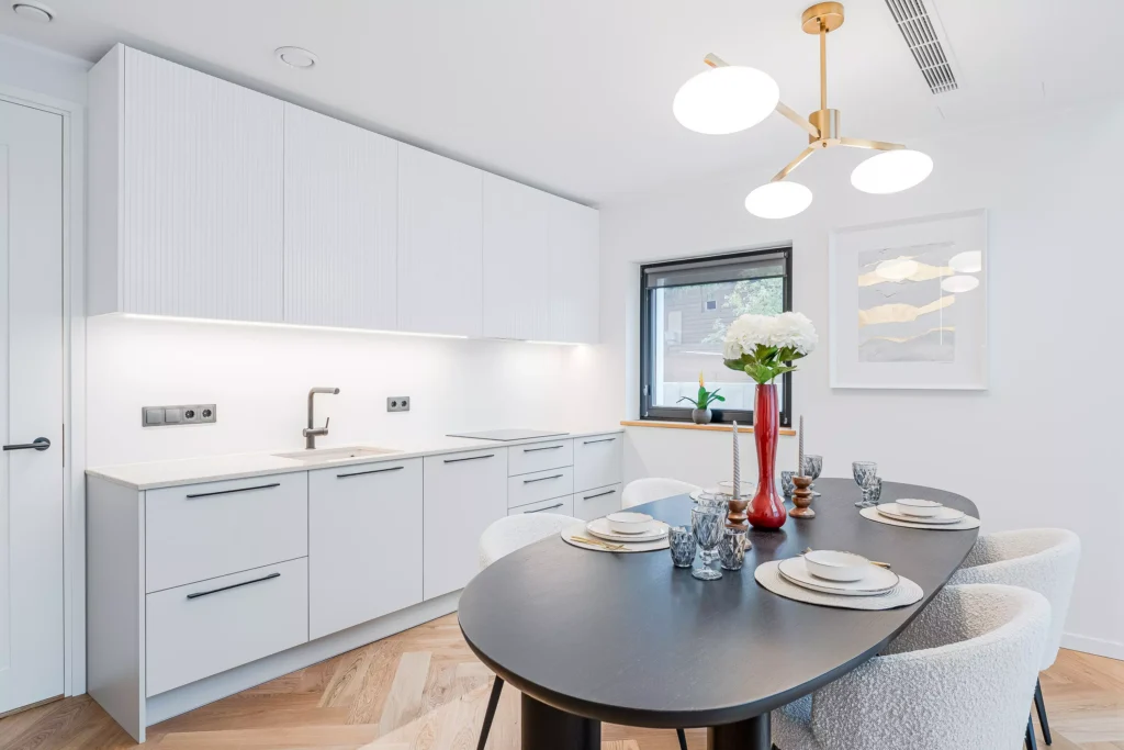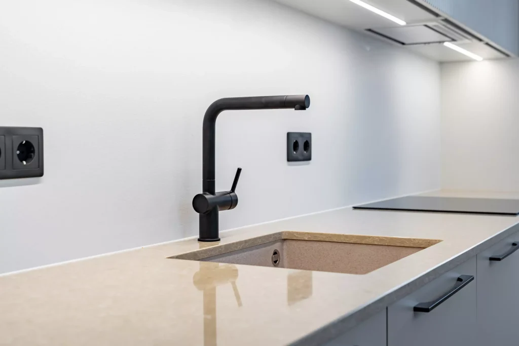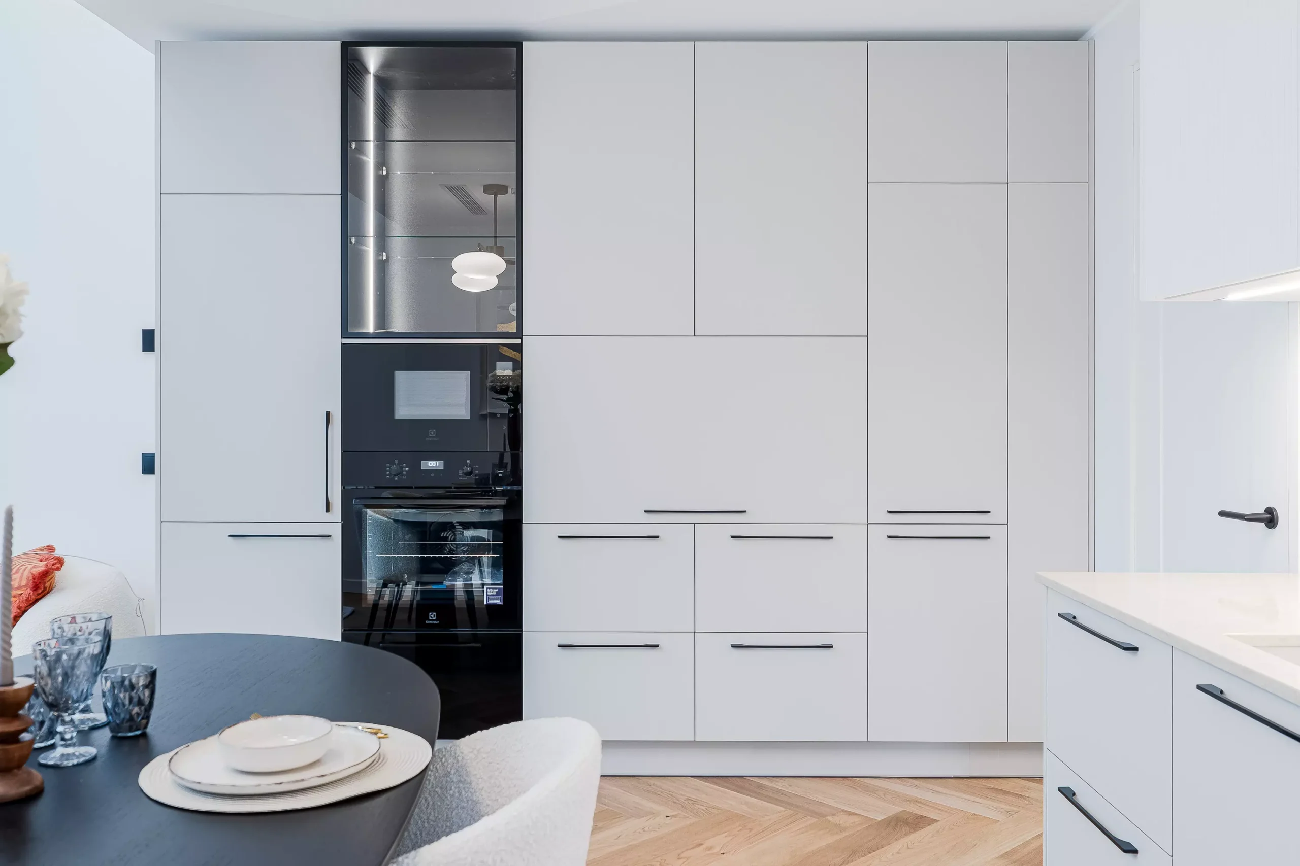 Современная минималистичная кухня с акцентом на чистые линии и контрастные детали.